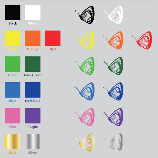 Color: There are 13 color for Butterfly Side Vinyl Sticker. They are Black, White, Yellow, Orange, Red, Green, Dark Green, Blue, Dark Blue, Pink, Purple, Silver, and Gold. The default color is black.