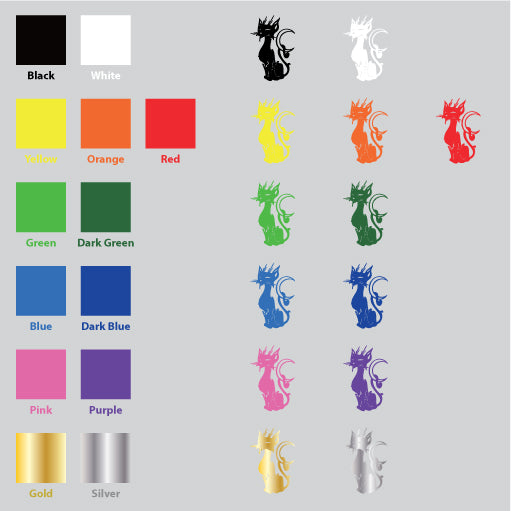 Color: There are 13 color for Cat Black Moon Vinyl Sticker. They are Black, White, Yellow, Orange, Red, Green, Dark Green, Blue, Dark Blue, Pink, Purple, Silver, and Gold. The default color is black.