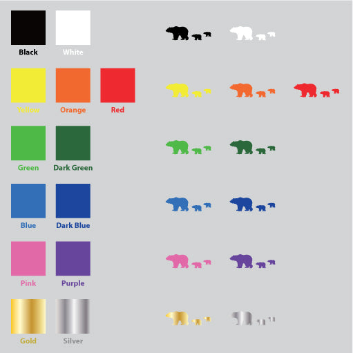 Color: There are 13 color for North Pole Bear Family Vinyl Sticker. They are Black, White, Yellow, Orange, Red, Green, Dark Green, Blue, Dark Blue, Pink, Purple, Silver, and Gold. The default color is black.