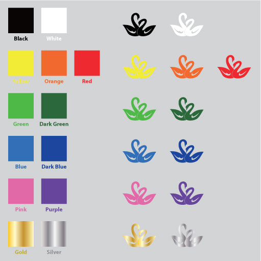 Color: There are 13 color for Swan In Love Swim Vinyl Sticker. They are Black, White, Yellow, Orange, Red, Green, Dark Green, Blue, Dark Blue, Pink, Purple, Silver, and Gold. The default color is black.