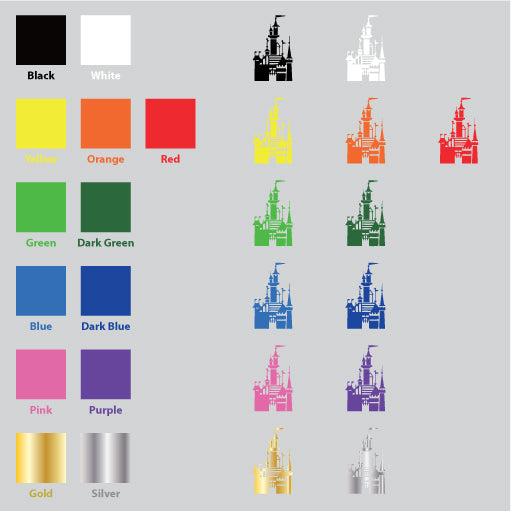 Color: There are 13 color for Castle Dream Vinyl Sticker. They are Black, White, Yellow, Orange, Red, Green, Dark Green, Blue, Dark Blue, Pink, Purple, Silver, and Gold. The default color is black.