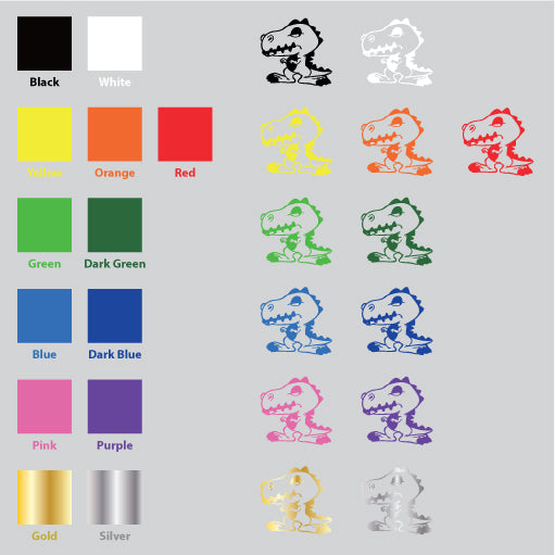 Color: There are 13 color for T-Rex Look Vinyl Sticker. They are Black, White, Yellow, Orange, Red, Green, Dark Green, Blue, Dark Blue, Pink, Purple, Silver, and Gold. The default color is black.