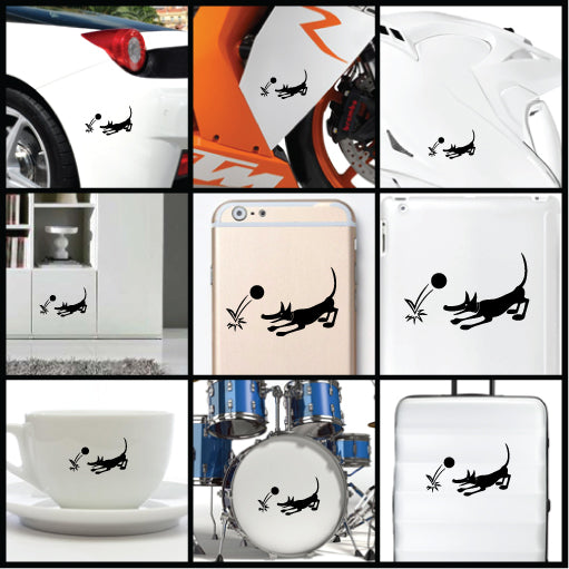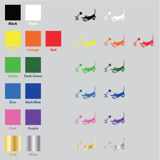 Color: There are 13 color for Dog Fetch Vinyl Sticker. They are Black, White, Yellow, Orange, Red, Green, Dark Green, Blue, Dark Blue, Pink, Purple, Silver, and Gold. The default color is black.