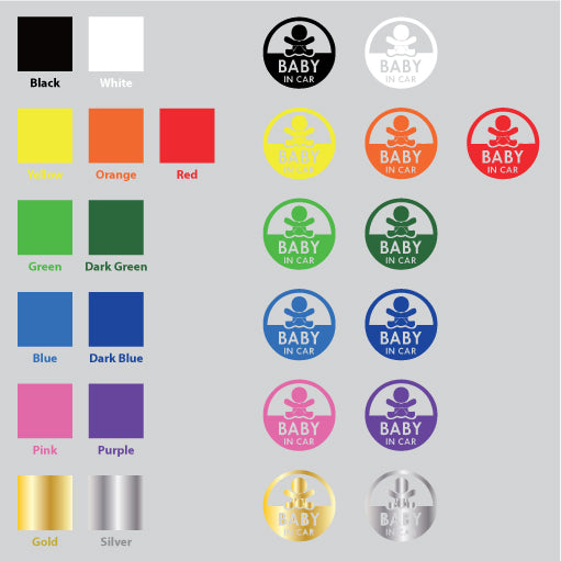 Color: There are 13 color for Baby In Car Circle Vinyl Sticker. They are Black, White, Yellow, Orange, Red, Green, Dark Green, Blue, Dark Blue, Pink, Purple, Silver, and Gold. The default color is black.
