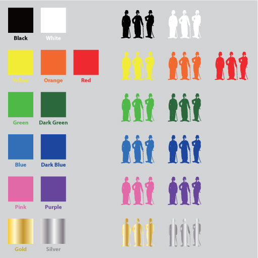 Color: There are 13 color for Charlie Chaplin Stand Post Vinyl Sticker. They are Black, White, Yellow, Orange, Red, Green, Dark Green, Blue, Dark Blue, Pink, Purple, Silver, and Gold. The default color is black.