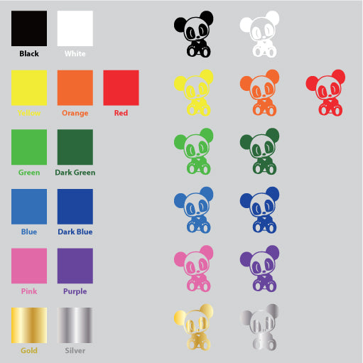 Color: There are 13 color for JDM Team Panda Vinyl Sticker. They are Black, White, Yellow, Orange, Red, Green, Dark Green, Blue, Dark Blue, Pink, Purple, Silver, and Gold. The default color is black.