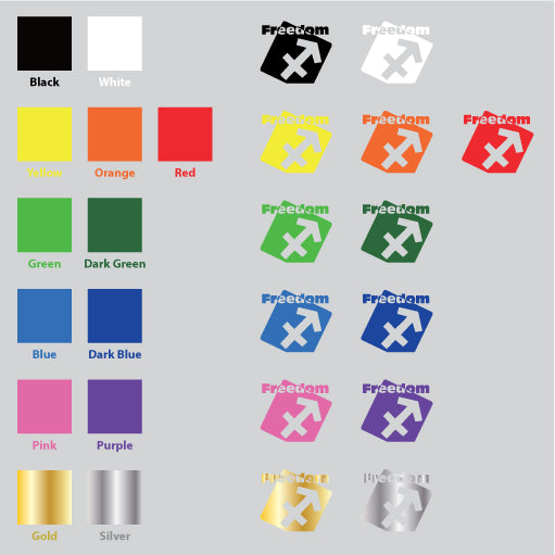 Color: There are 13 color for Sagittarius Freedom In Blood Vinyl Sticker. They are Black, White, Yellow, Orange, Red, Green, Dark Green, Blue, Dark Blue, Pink, Purple, Silver, and Gold. The default color is black.