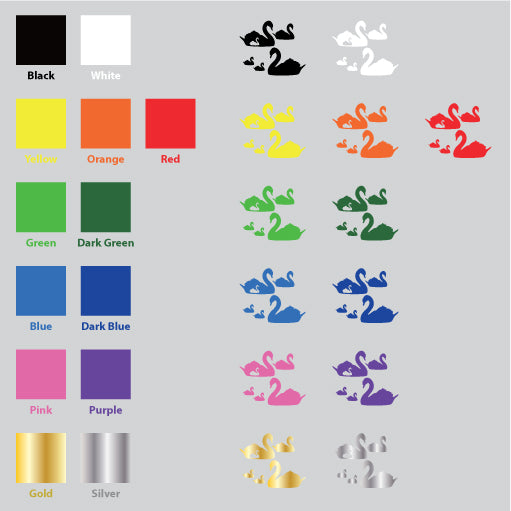 Color: There are 13 color for Swan Family Vinyl Sticker. They are Black, White, Yellow, Orange, Red, Green, Dark Green, Blue, Dark Blue, Pink, Purple, Silver, and Gold. The default color is black.
